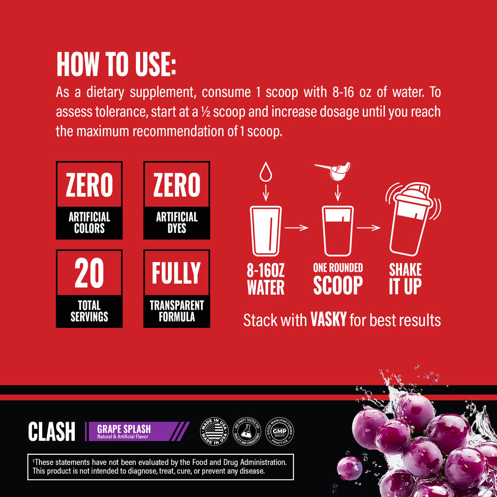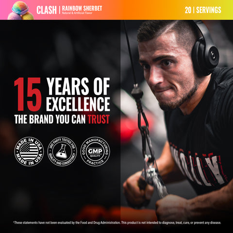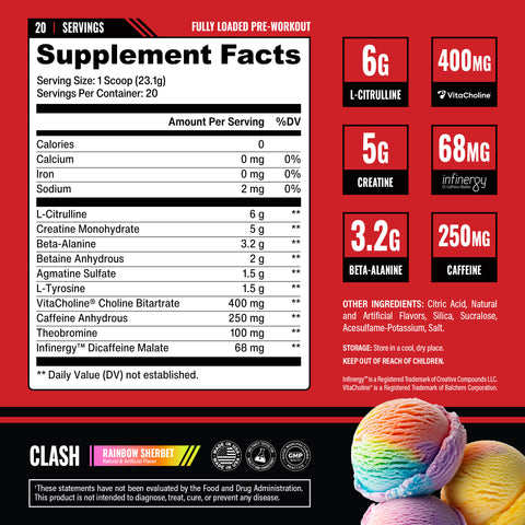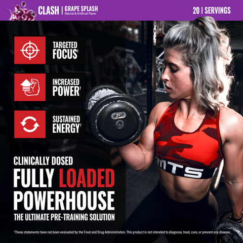 With clinically proven ingredients like Citrulline Malate, Carnosyn® Beta-Alanine, Creapure® Creatine Monohydrate, and AGmass™ Agmatine Sulfate, Clash Pre-Workout fuels maximum endurance, strength gains, and mental drive—making it the top choice for anyone looking for the best pre-workout supplement.